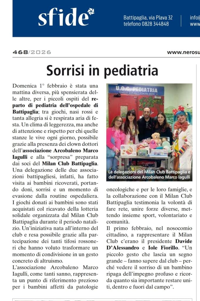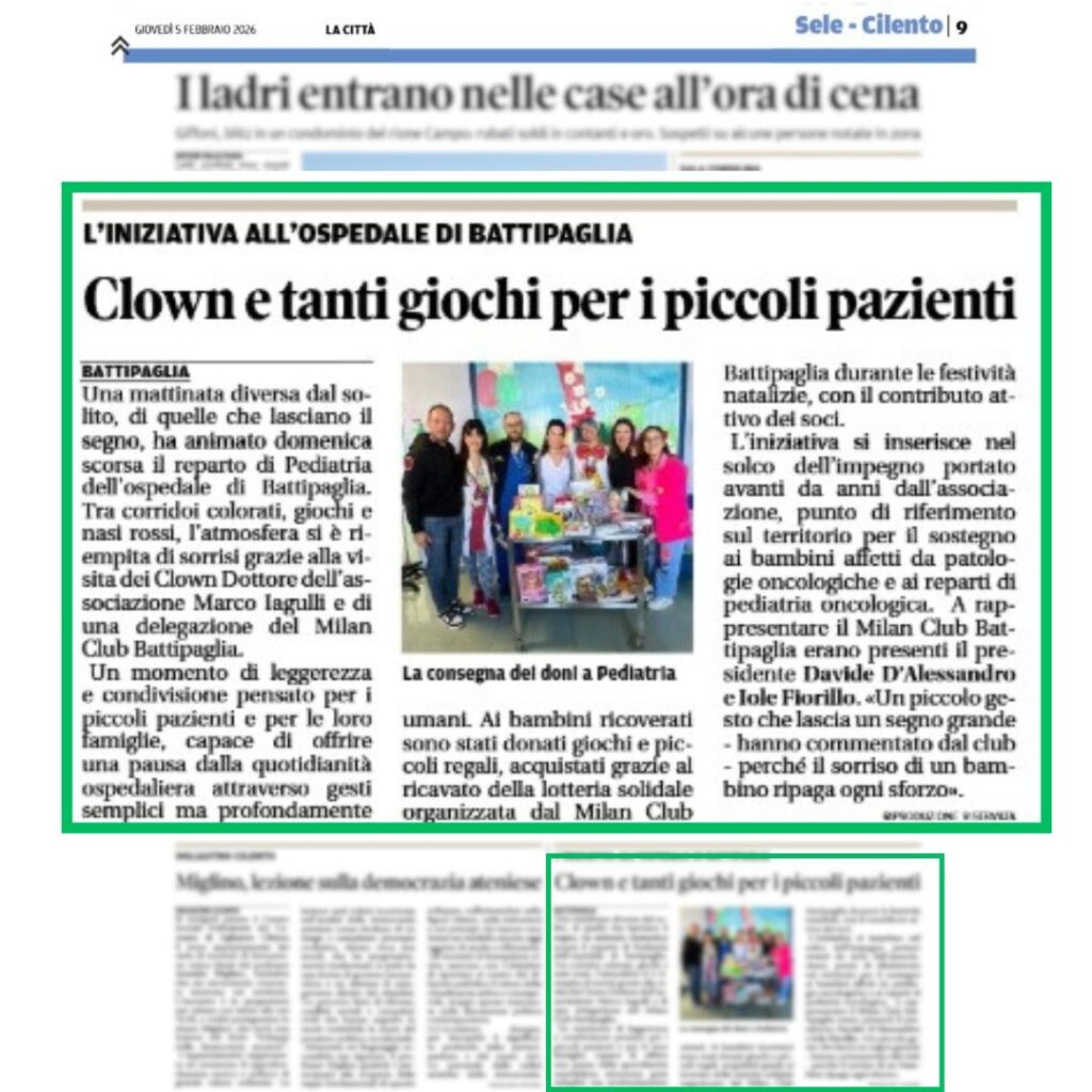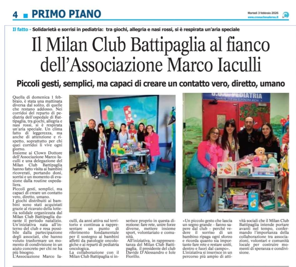Con piacere condividiamo sul nostro sito l’articolo che Le Cronache di Salerno ha dedicato alla giornata di solidarietà vissuta nel reparto di pediatria, insieme ai Clown Dottori e agli amici del Milan Club Battipaglia. Un racconto che restituisce il senso più autentico dei piccoli gesti: vicinanza, leggerezza e presenza concreta accanto ai bambini e alle loro famiglie.