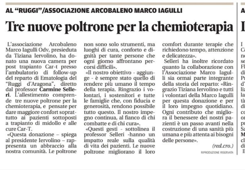 «Questa donazione – dichiara Tiziana Iervolino, presidente dell’Associazione Arcobaleno Marco Iagulli – rappresenta un abbraccio alla nostra comunità. Le poltrone non sono solo strumenti, ma luoghi di cura, conforto e dignità per tante persone che ogni giorno affrontano percorsi difficili. Il nostro obiettivo è sempre stato quello di rendere più umano il tempo della terapia. Ringrazio i volontari, i sostenitori e tutte le famiglie che, con fiducia e generosità, rendono possibile tutto questo. Il nostro impegno continua, al fianco di chi combatte e di chi cura».